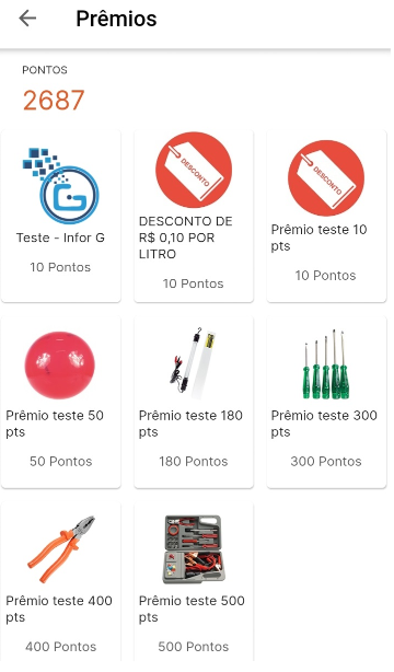 - Selecionando prêmios, uma nova tela com todos os prêmios disponíveis ao cliente irá aparecer. Basta você selecionar o prêmio e prosseguir: