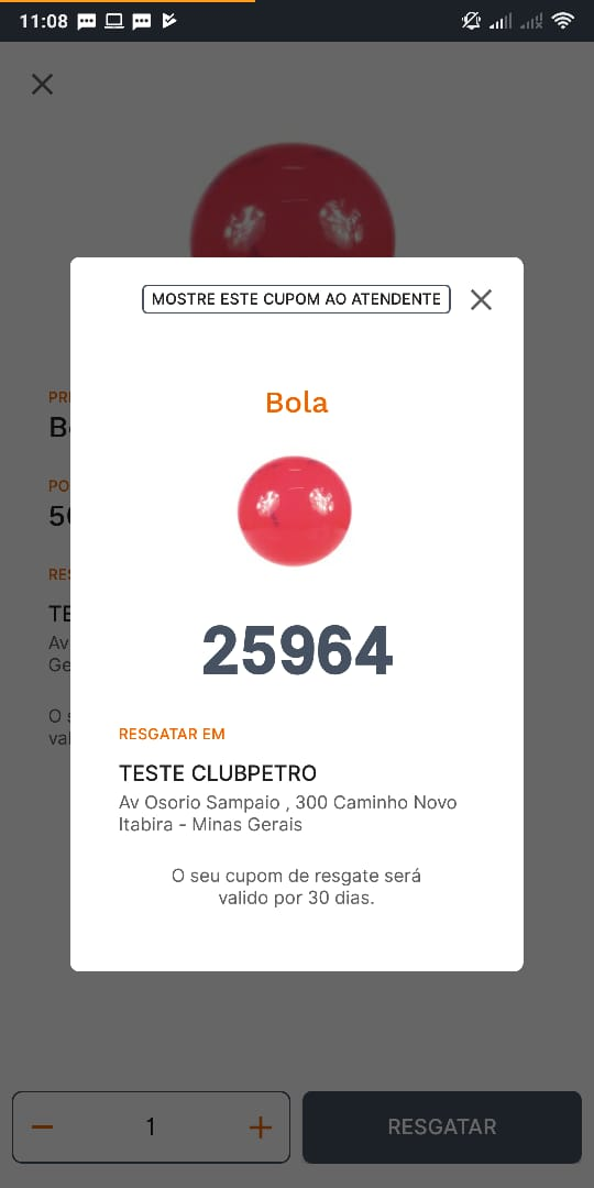 Na imagem abaixo o cliente já realizou o resgate pelo aplicativo e já está com o código disponível: