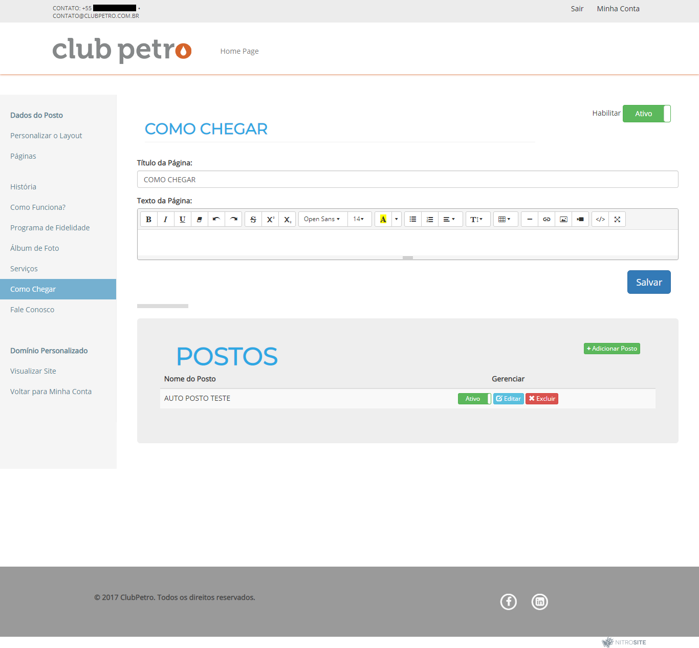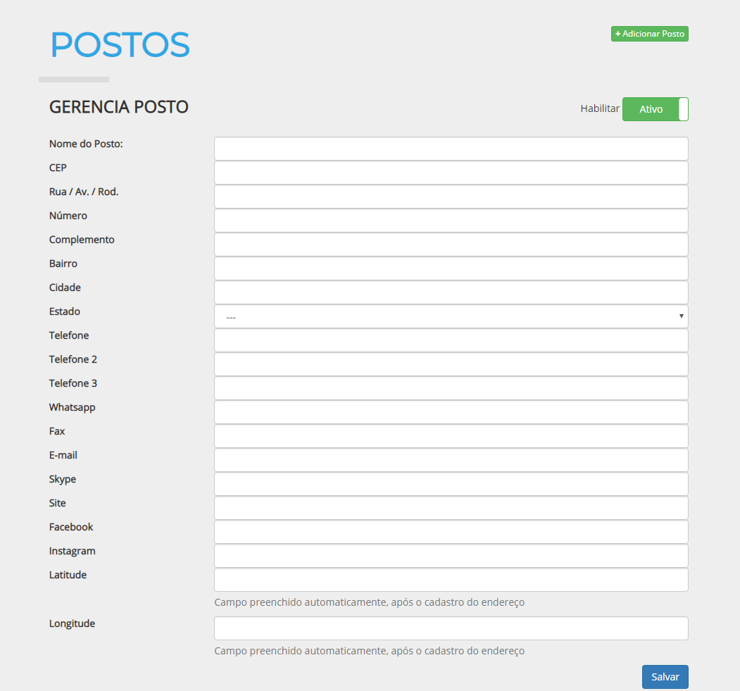 Para inserir a localização, clique na opção "Adicionar Posto", e preencha todos os campos com as informações requeridas.