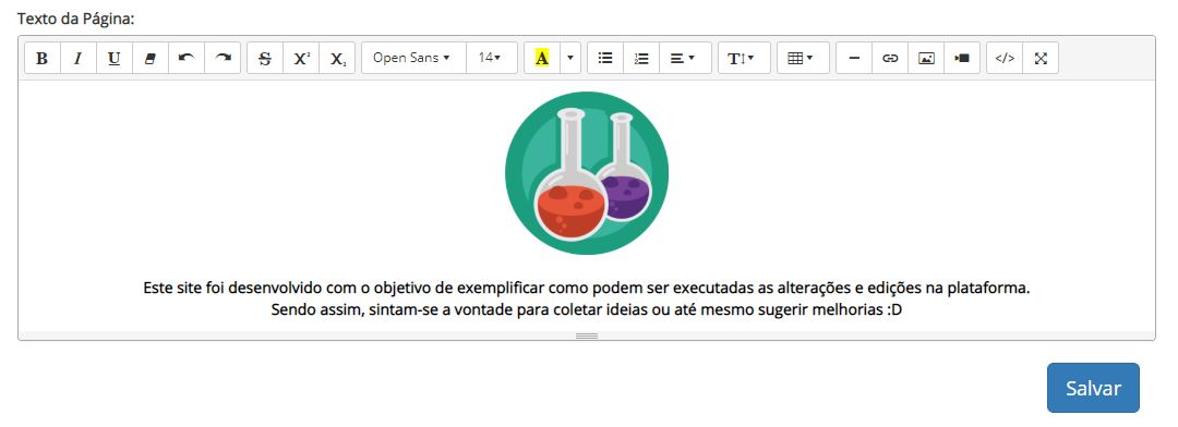 Para isso, contamos com uma caixa de texto, onde você pode utilizar diferentes fontes e cores de texto, podem ser anexadas imagens, vídeos, links, tabelas e tudo o que possa auxiliar nesta tarefa.