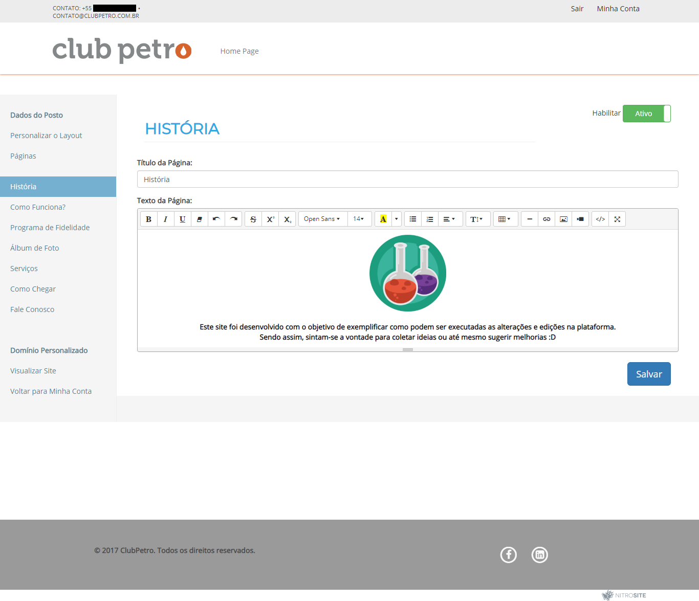 A Página "História" é destinada a contar um pouco da história do seu Posto.