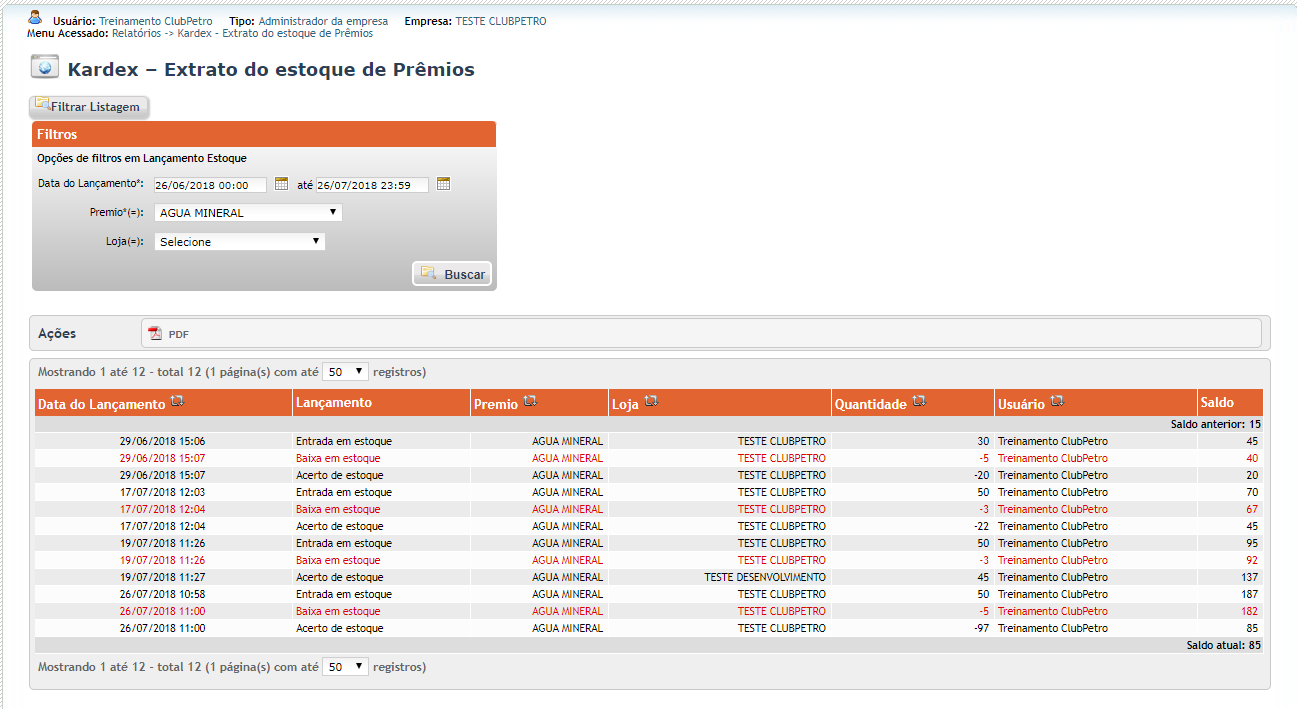 O Relatório que pode ser exportado em PDF, mostra quando houve entrada e baixa de estoque e o saldo do prêmio analisado, dentro do Período pesquisado, além do responsável por estas ações.