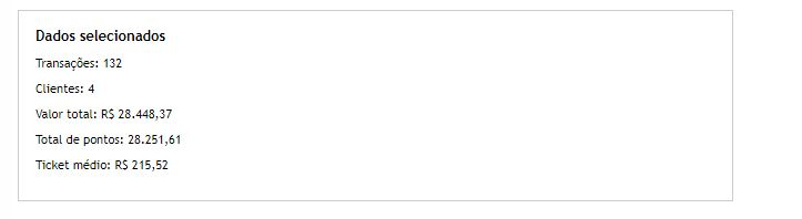 Serão exibidas todas as vendas fidelizadas realizadas no período informado e que estejam condicentes com os dados dos filtros, exibindo nome dos clientes, número de seu cartão/etiqueta, Id da venda, loja, data, valor da venda, quantidade de pontos concedida, e vendedor responsável (caso haja RFID cadastrado).