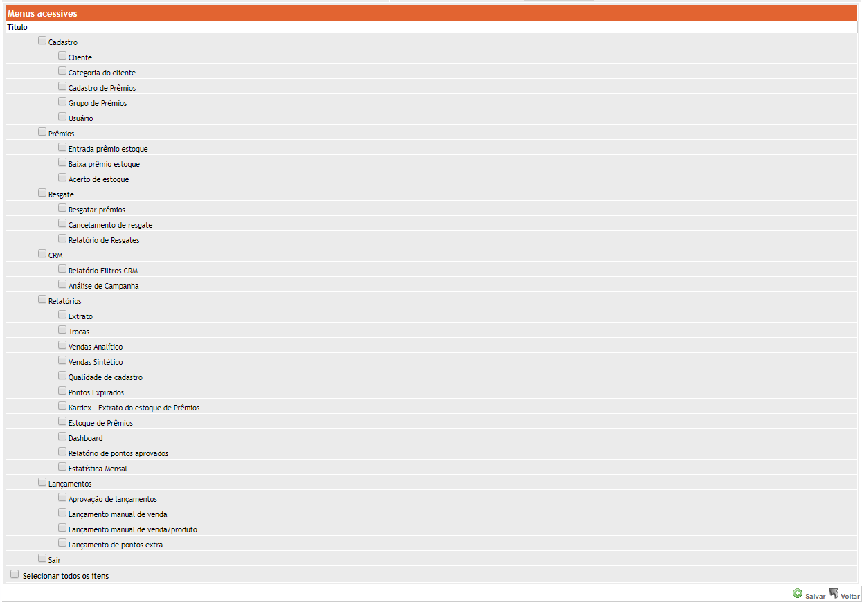 Agora escolha quais Funcionalidades do Sistema o seu usuário terá acesso, lembrando que recomendamos liberar apenas o que for necessário. Além disso, algumas funcionalidades permitem algum tipo de fraude, sendo assim, só devem ser liberadas para funcionários de confiança.