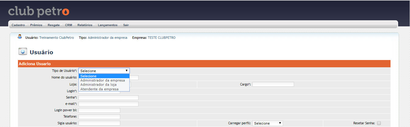 Em seguida, deverão ser preenchidas as informações requeridas, como o Tipo de Usuário, se ele é responsável por toda a Rede/Empresa, se é responsável por uma das lojas da empresa ou se ele é um atendente de uma das lojas.