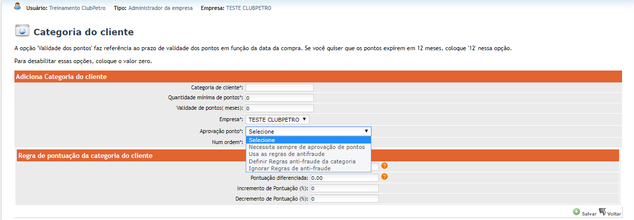 Na Categoria do Cliente também é possível escolher uma Regra de Pontuaçãoexclusiva para aquela Categoria.