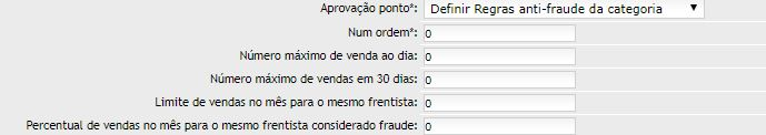 - Definir as regras da categoria: nesta opção você definirá a regra antifraude que será exclusiva daquela categoria do cliente. Os itens a serem determinados são: o número máximo de venda ao dia; o número máximo de vendas em 30 dias; o limite de vendas no mês para o mesmo frentista e o percentual de vendas no mês para o mesmo frentista considerado fraude.