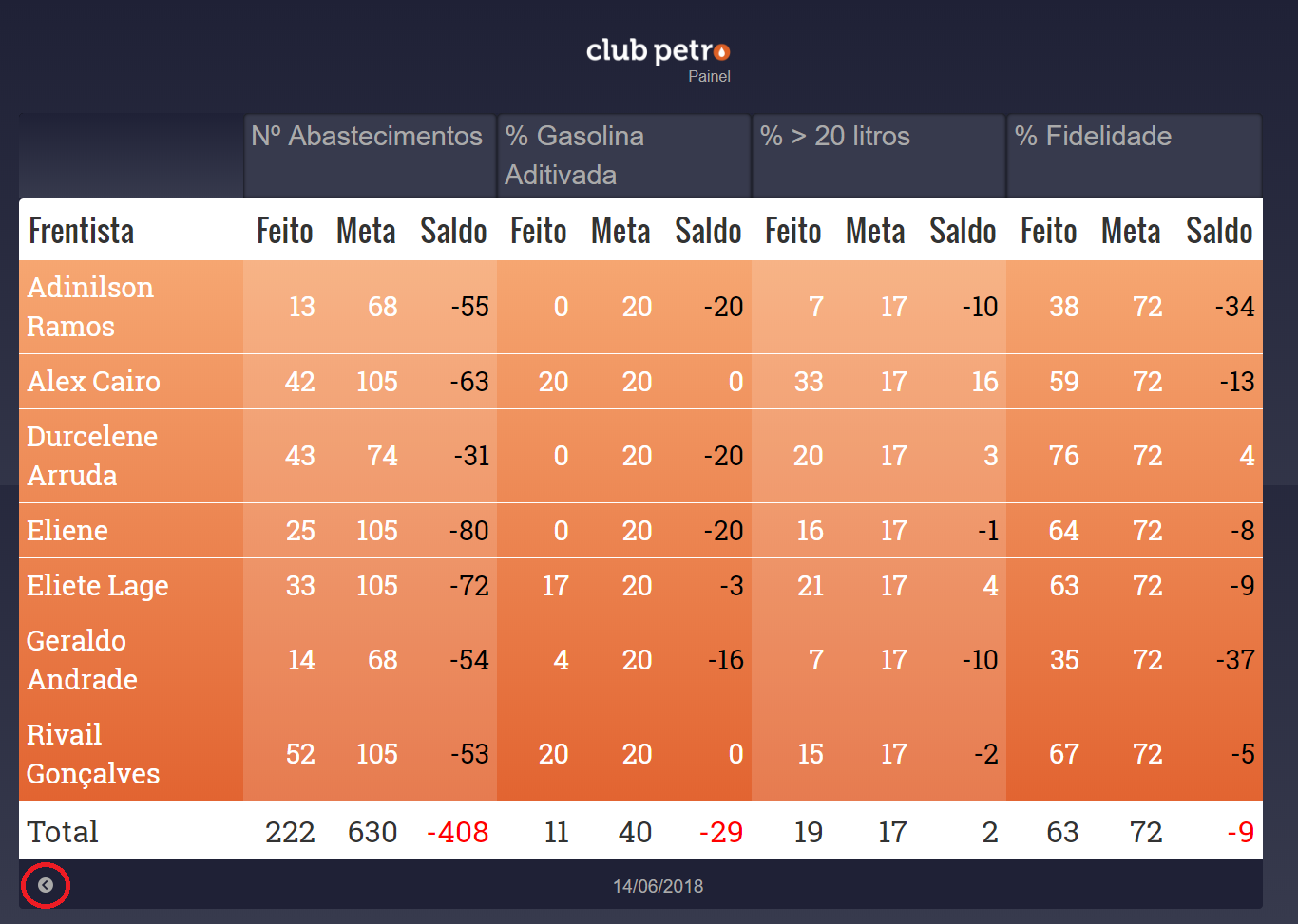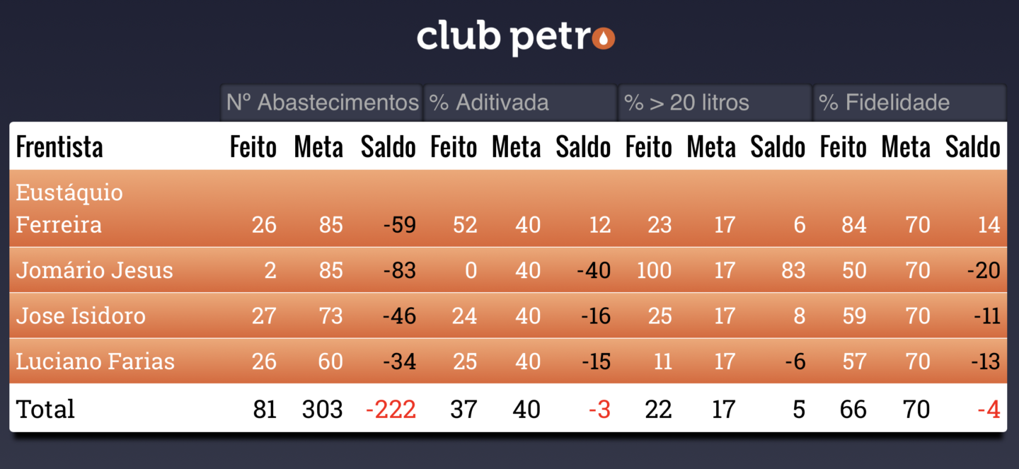 O Dashboard é a tela de Gestão a Vista do ClubPetro, disponível com todas as informações do desempenho dos frentistas. É recomendável que seja fixada uma tela no caixa ou nos terminais ClubPetro do posto, para que todos possam ter acesso.