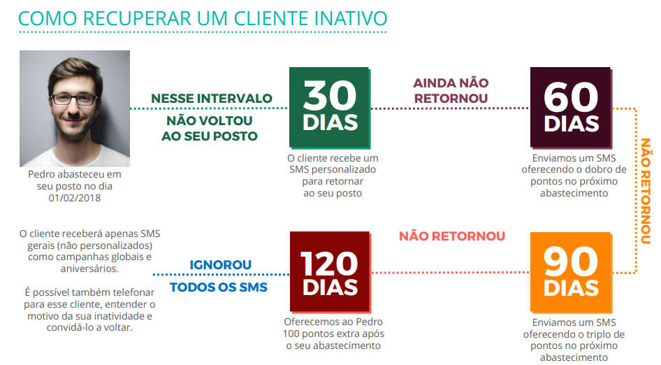 Criamos faixas de inatividade de 30, 60 e 90 dias (igual ao fluxo acima). Diante disso, devemos tomar algumas medidas para recuperar esse cliente, ou seja, fazer com que ele volte a abastecer em seu posto e passe a frequentá-lo mais vezes.