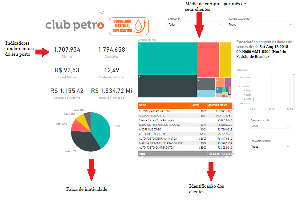 Tenha um visão geral da saúde de seus clientes. Aqui é possível ver o total de clientes cadastrados no programa, quantos deles estão ativos, qual categoria possui mais clientes...