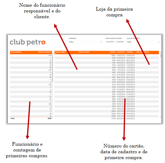 Observe qual funcionário fez a ativação do cliente no seu programa de fidelidade, ou seja, a primeira pontuação realizada, e quantas primeiras compras o funcionário foi responsável. Também pode conferir facilmente onde foi a primeira compra de seu cliente, qual seu número de cartão e as datas de cadastro e primeira compra.