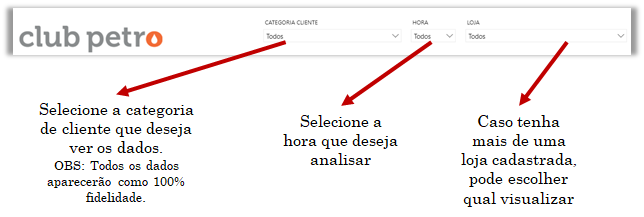 O Resumo do mês atual apresenta os principais dados, em uma visualização simples, de suas lojas. Pode-se filtrar horas específicas e categorias de clientes diferentes, bem como escolher entre uma ou mais lojas da rede.