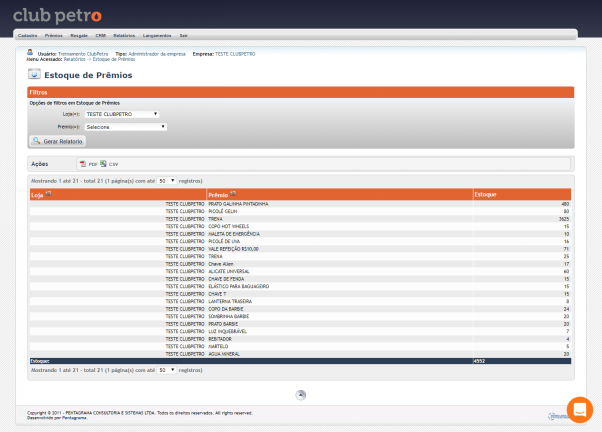 Para consultar la cantidad de elementos de algún premio dentro de su stock, ingrese el Informe Premios en stock (en almacén)