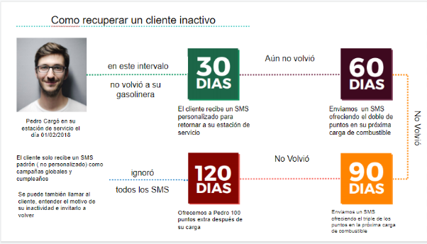 Crear rangos de inactividad de 30, 60 y 90 días (igual que el flujo anterior). Ante esto, debemos tomar algunas medidas para recuperar a este cliente, es decir, hacerle abastecer de nuevo en su gasolinera y hacerlo volver más a menudo.
