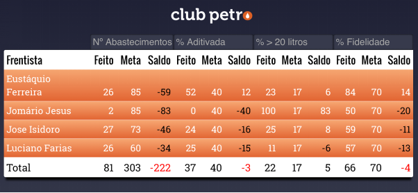 El dashboard es la pantalla de gestión a la vista del ClubPetro, disponible con todas las informaciones del desempeño de los despachadores o playeros. Normalmente en la pantalla del cajero o en las terminales ClubPetro de la estación de servicio.