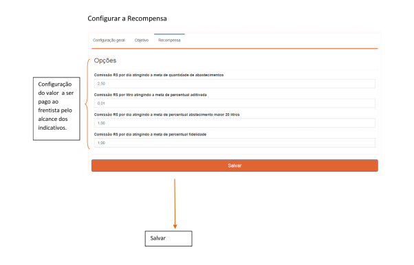 En la pestaña "Recompensas", es posible configurar los montos que se pagarán a los despachadores (playeros) de la estación de servicio en caso de un objetivo alcanzado. ¡Recuerde que estos valores motivarán a sus despachadores a lograr mejores resultados!