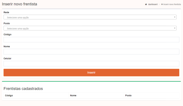 Haga clic en nuevo despachador, complete todas las informaciones solicitadas, siendo: Red, Estación de Servicio, Código (Código de RFID, está informação se encuentra en la tarjeta RFID), Nombre del despachador y celular.