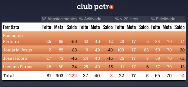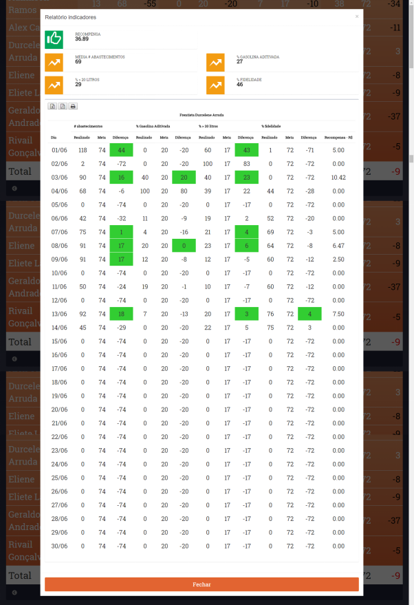 Las informaciones incluye el valor de la recompensa de este despachador (playero) hasta la fecha y sus números promedio de acuerdo con los índices elegidos para componer el Panel.