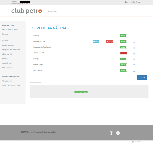 La plataforma del sitio web inicialmente llega con 6 páginas listas: Historia, Programa de fidelización, Fotos, Cómo llegar y Contáctenos.