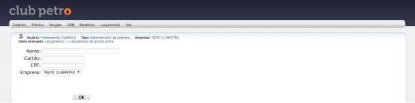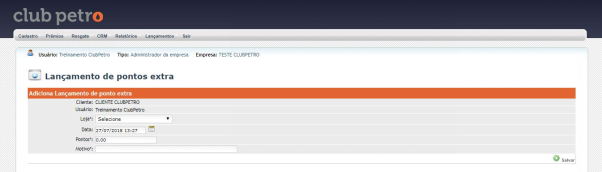 Será presentada una página identificando a su cliente, rellene los campos informando; la tienda de compra, fecha, cantidad de puntos que serán concedidos al cliente y la descripción del Motivo de lanzamiento