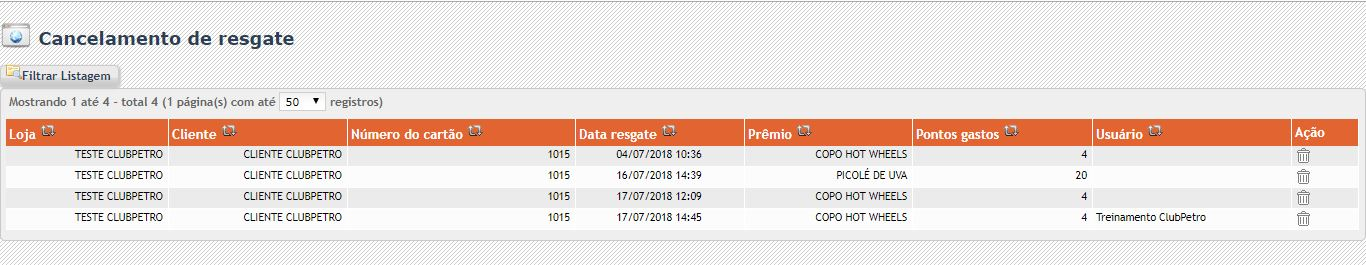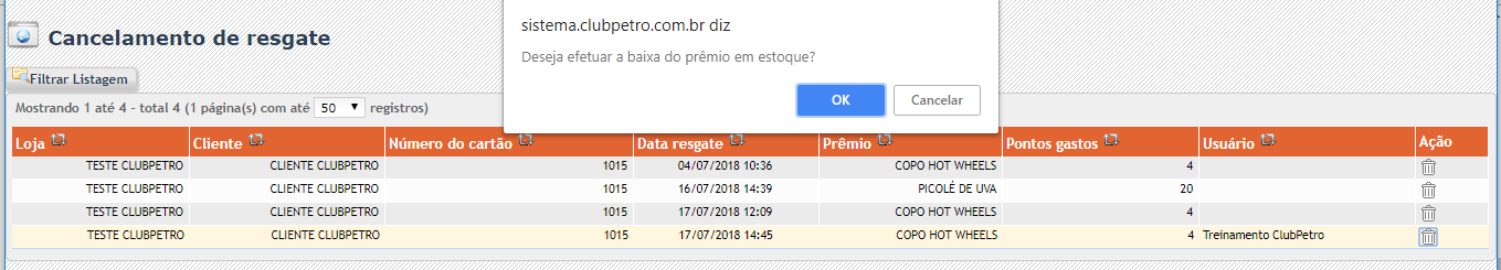 Se abrirá una página que contiene todos los canjes ya realizados por este cliente, luego haga clic en el bote de basura correspondiente al canje que desea cancelar y el sistema le pedirá que ingrese el motivo. Luego, simplemente haga clic en Aceptar.