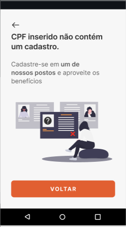 Se alguém que não tem o cadastro no programa de fidelidade baixar o aplicativo e tentar fazer o login, o CPF dessa pessoa não será encontrado em nossa base de dados, e ela será instruída a procurar um posto para fazer o seu cadastro.