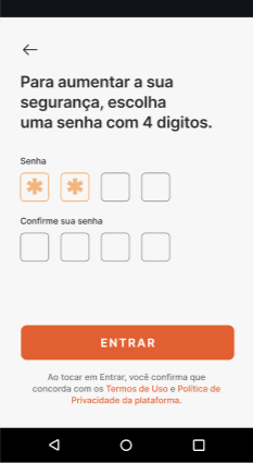 Com o código inserido corretamente, o cliente estará apto para escolher uma senha de 4 dígitos que será utilizada para os próximos logins dele no aplicativo
