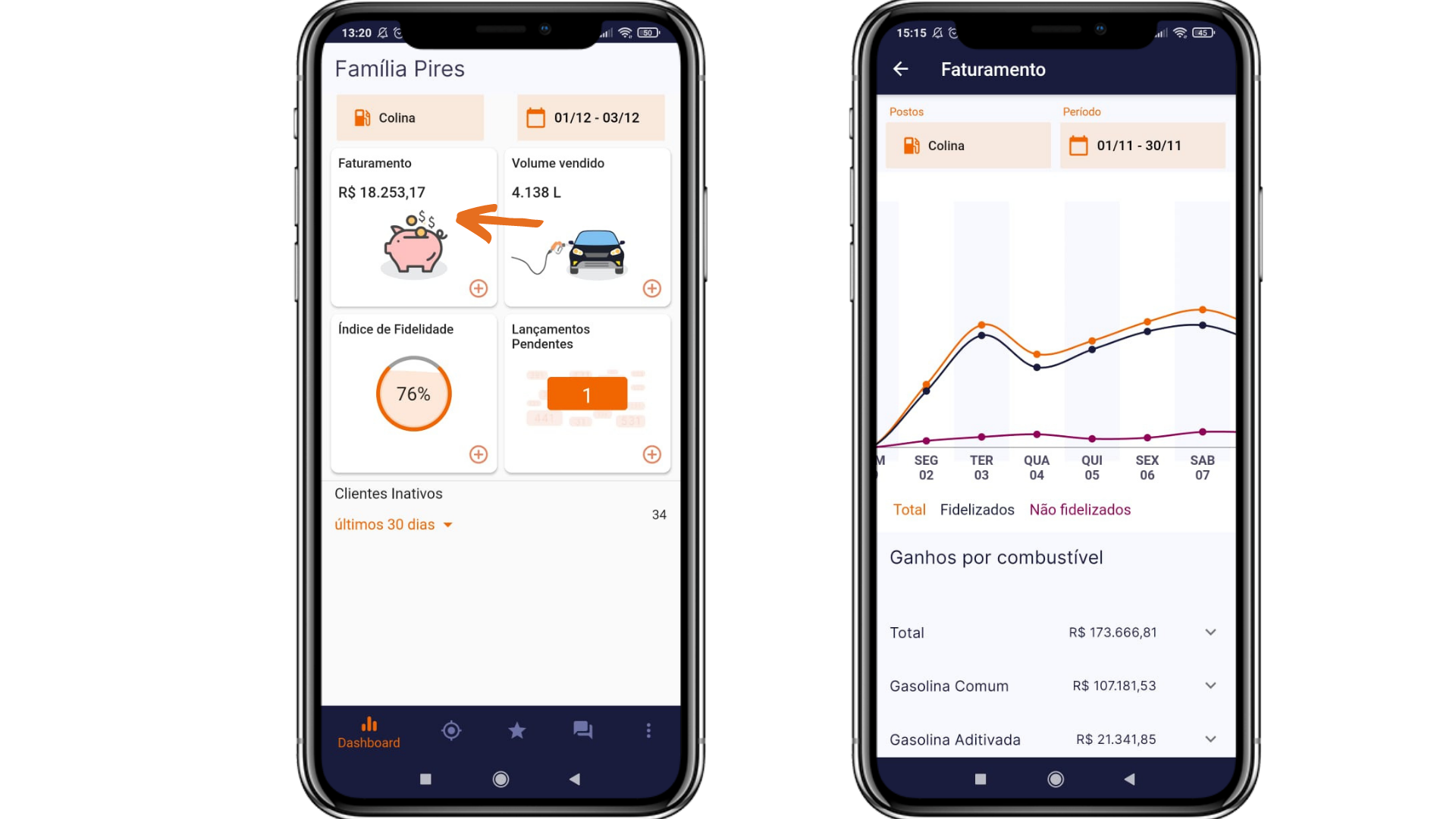 Também é possível visualizar o valor fidelizado e o não fidelizado alterando entre as opções Total, Fidelizados e Não Fidelizados localizadas acima do gráfico (entre os filtros de postos e período e o gráfico).