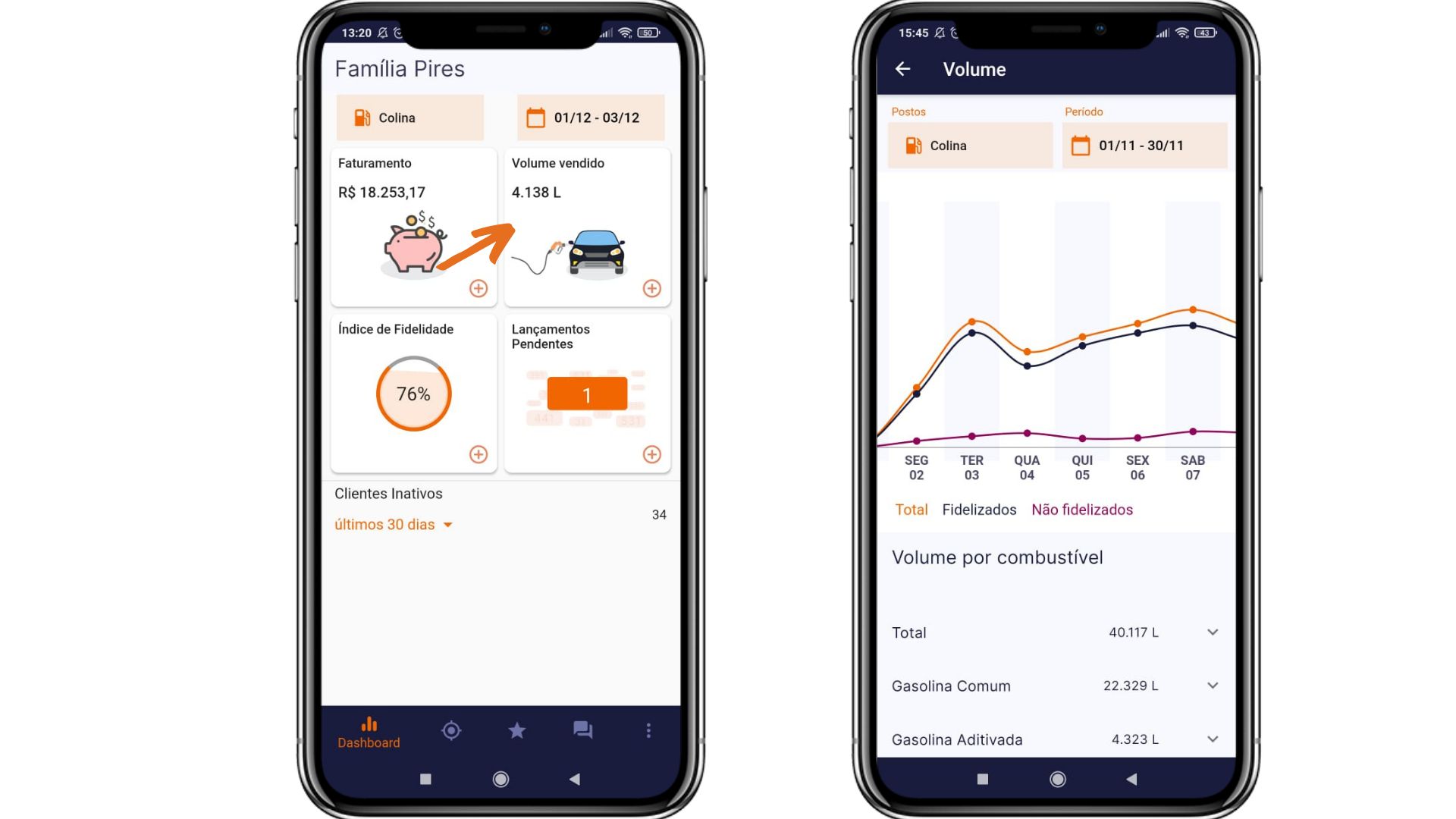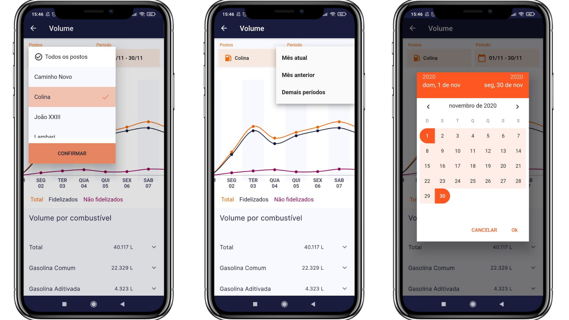 Também é possível visualizar o volume fidelizado e o não fidelizado alterando entre as opções Total, Fidelizados e Não Fidelizados localizadas acima do gráfico (entre os filtros de postos e período e o gráfico).