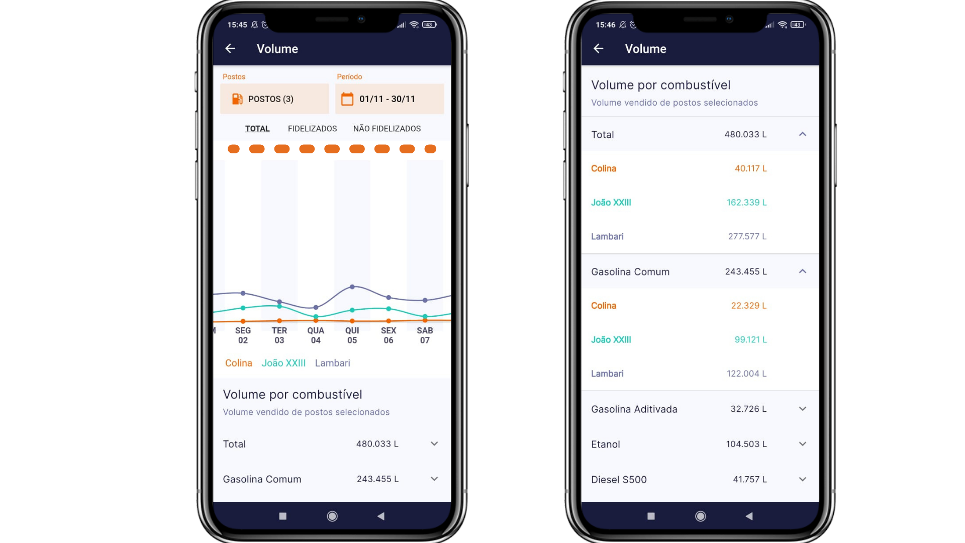 Da mesma forma, os dados expandidos do Volume por combustível são divididos entre o volume total vendido, o volume fidelizado vendido e o volume não fidelizado vendido.