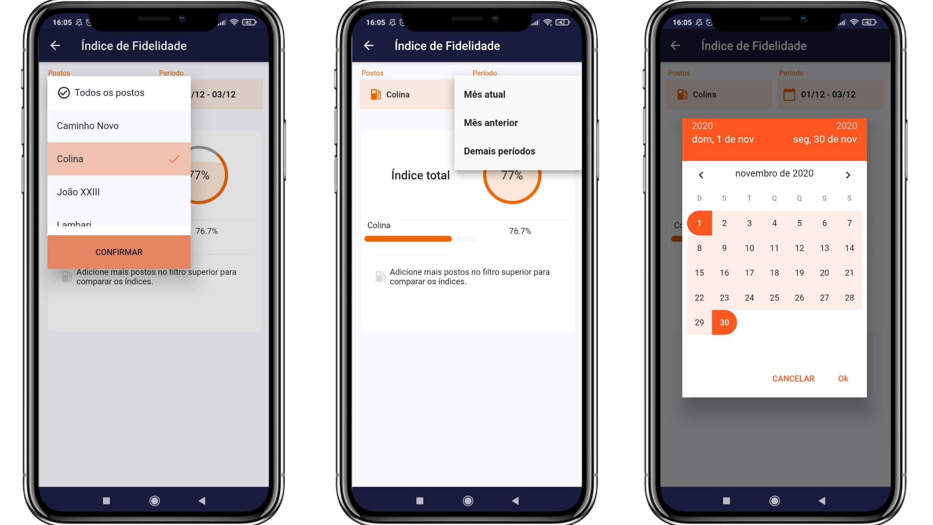 No Dashboard, clicando em Índice de Fidelidade, é possível visualizar o Índice de Fidelidade total, calculado de acordo com a quantidade de postos filtrados, o Índice de Fidelidade individual de cada um deles e o período selecionado.
