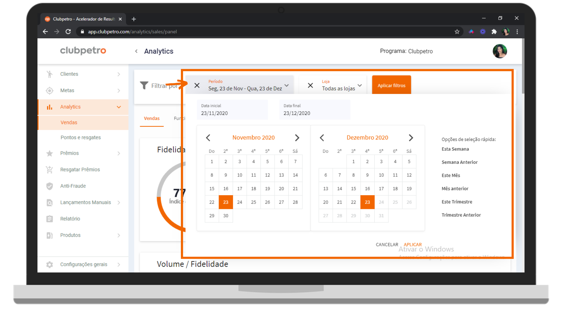 Representa a porcentagem de venda fidelizada, em R$, em relação as vendas totais, em R$, no período selecionado.