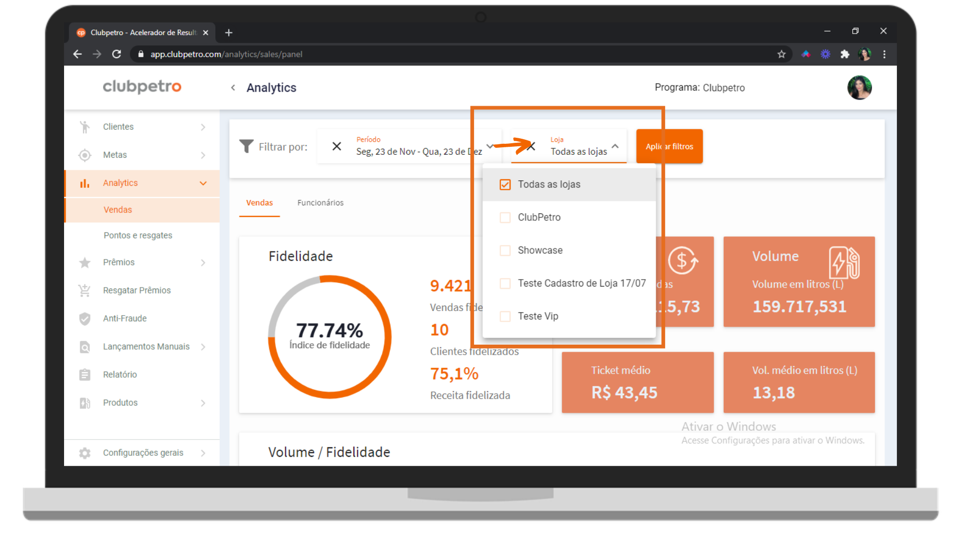 O filtro Lojas é preenchido com todas as lojas cadastradas no Programa e é possível selecionar uma, várias ou todas para analisar ao mesmo tempo.
