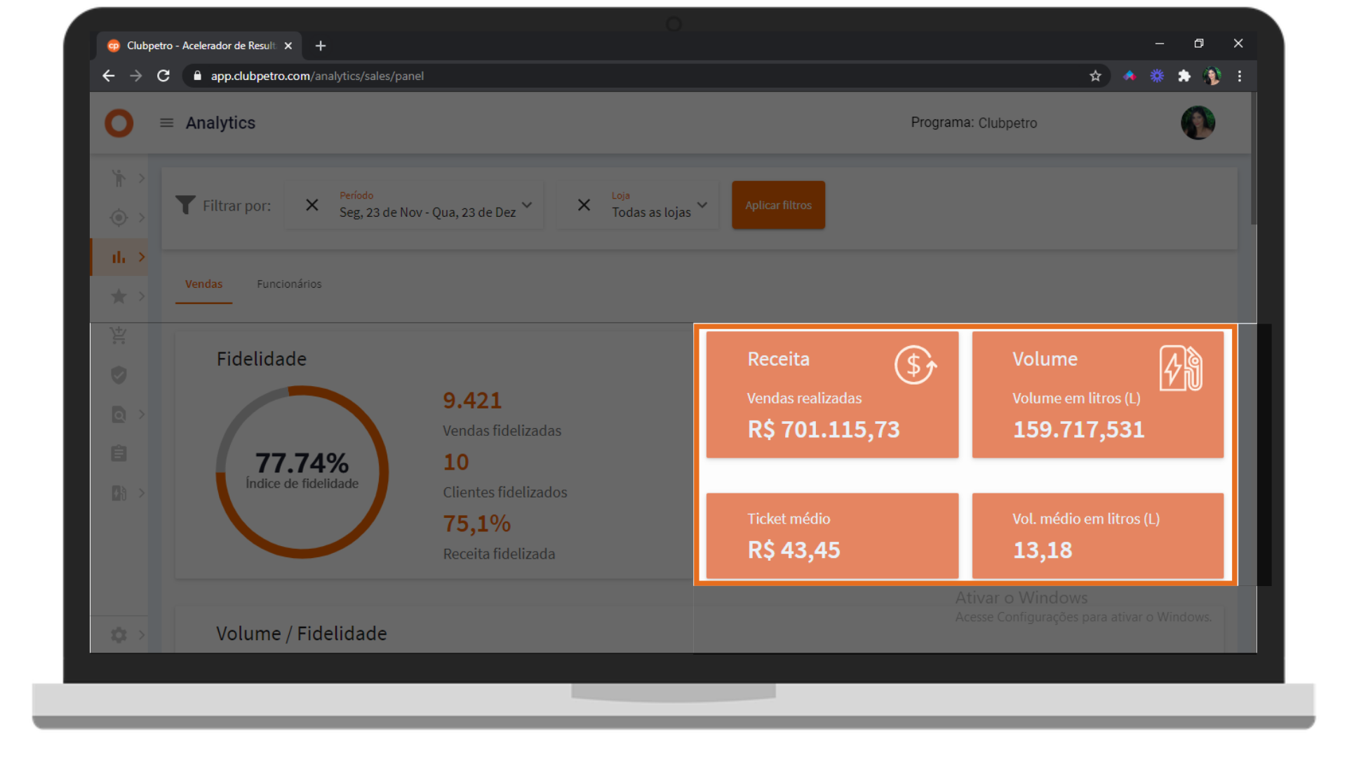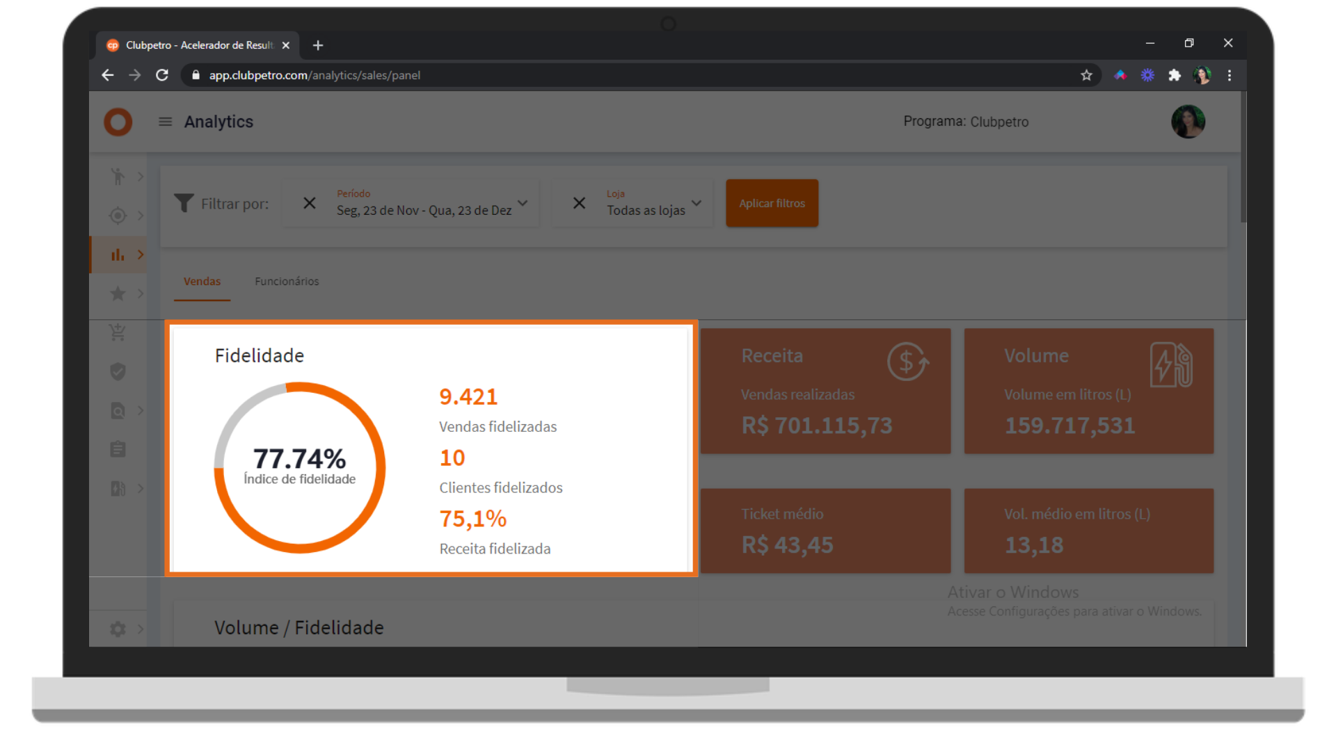 O Índice de fidelidade representa a porcentagem de vendas fidelizadas em relação à venda total do posto no período selecionado.