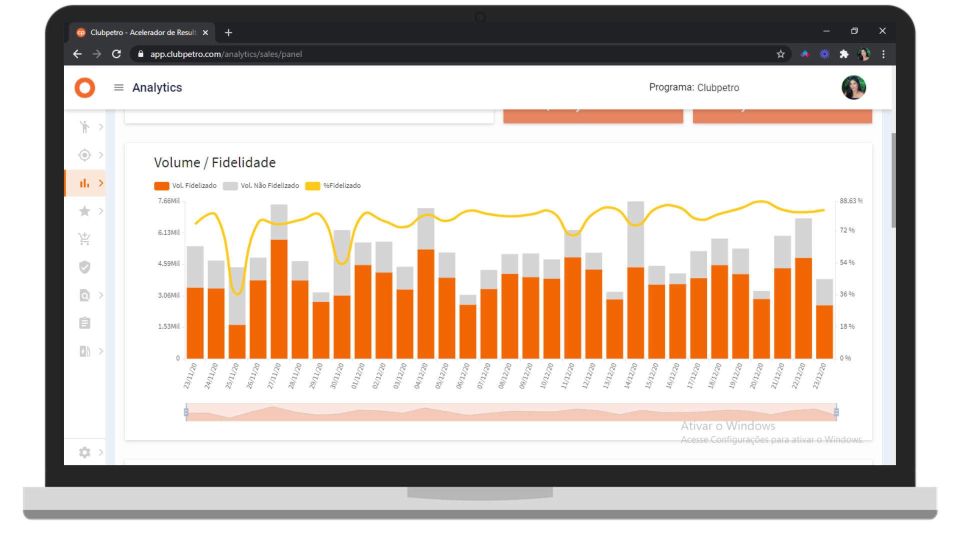 As barras laranjas mostram a quantidade de volume fidelizado vendido e as barras cinzas representam a quantidade de volume não fidelizado vendido. A linha amarela, por sua vez, revela a porcentagem de volume fidelizado em comparação a quantidade total de volume vendido.