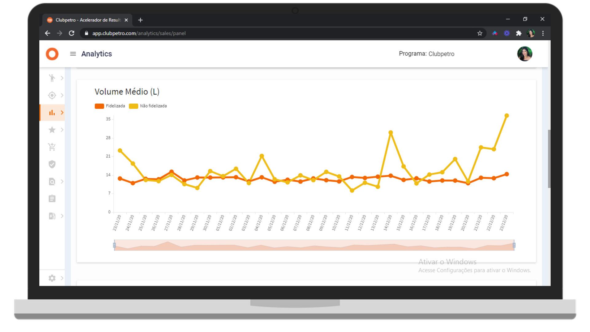 A linha laranja mostra o volume médio fidelizados, enquanto a linha amarela representa o volume médio não fidelizados do posto.