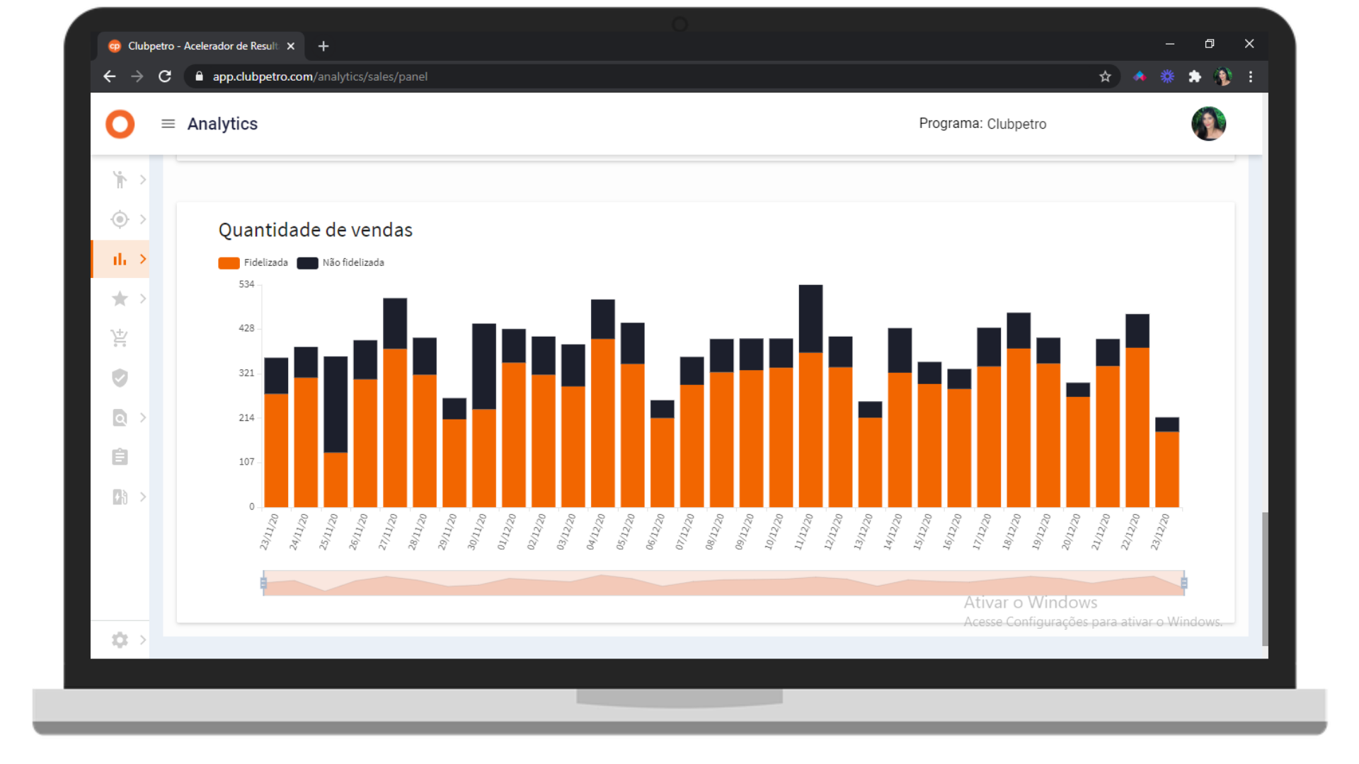 As barras laranjas contemplam a quantidade de vendas fidelizados e as barras azuis/pretas o número de vendas não fidelizadas.