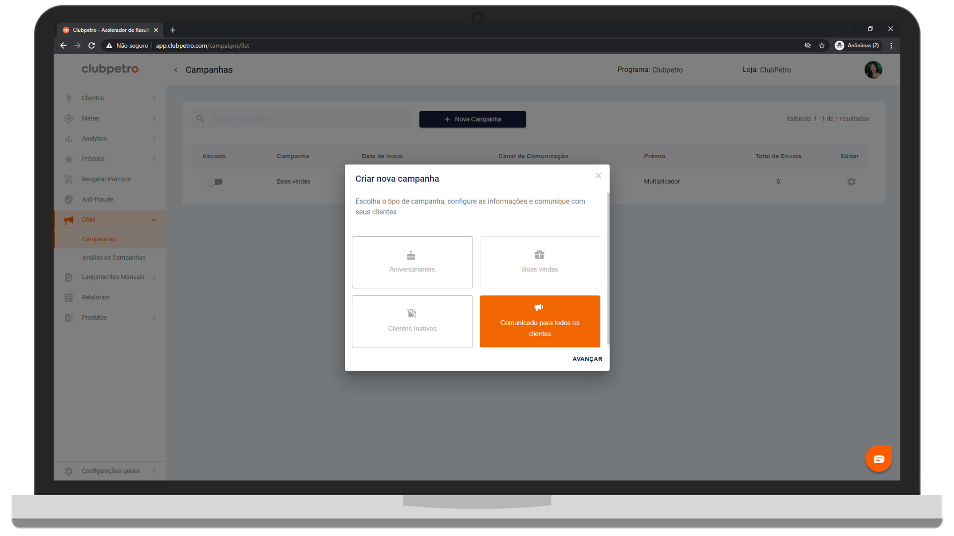 3. Selecione o tipo de campanha Comunicado para todos os clientes.