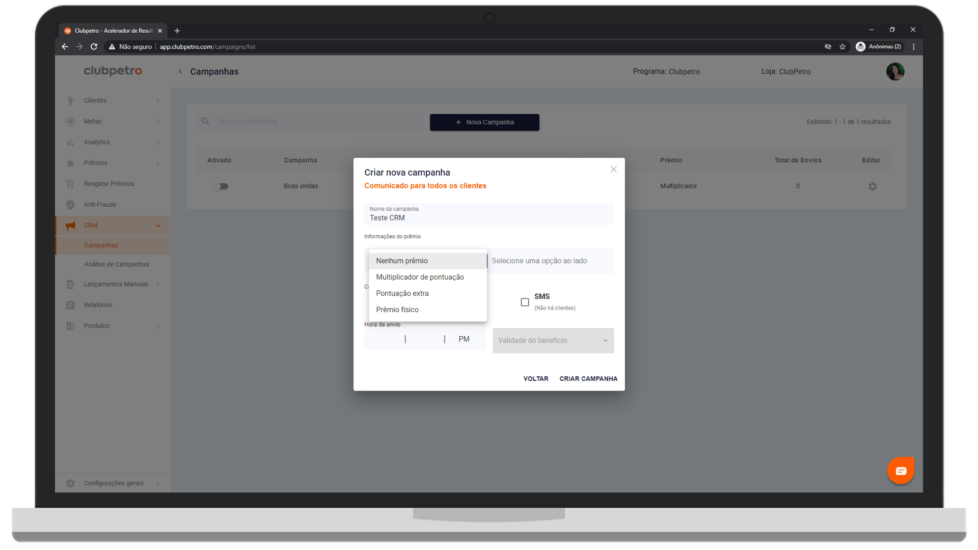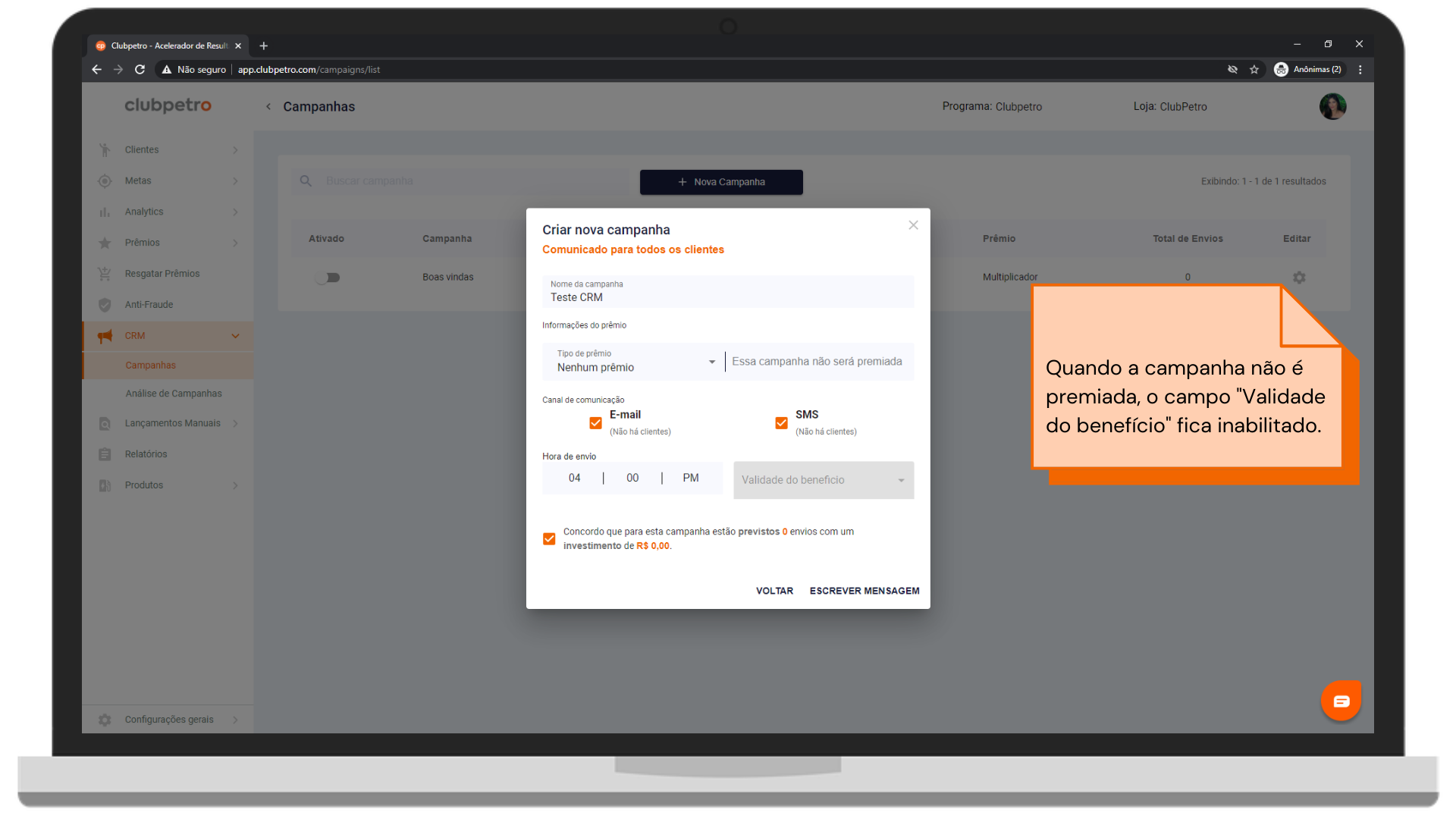 1. No menu lateral, clique em CRM e depois em Campanhas.