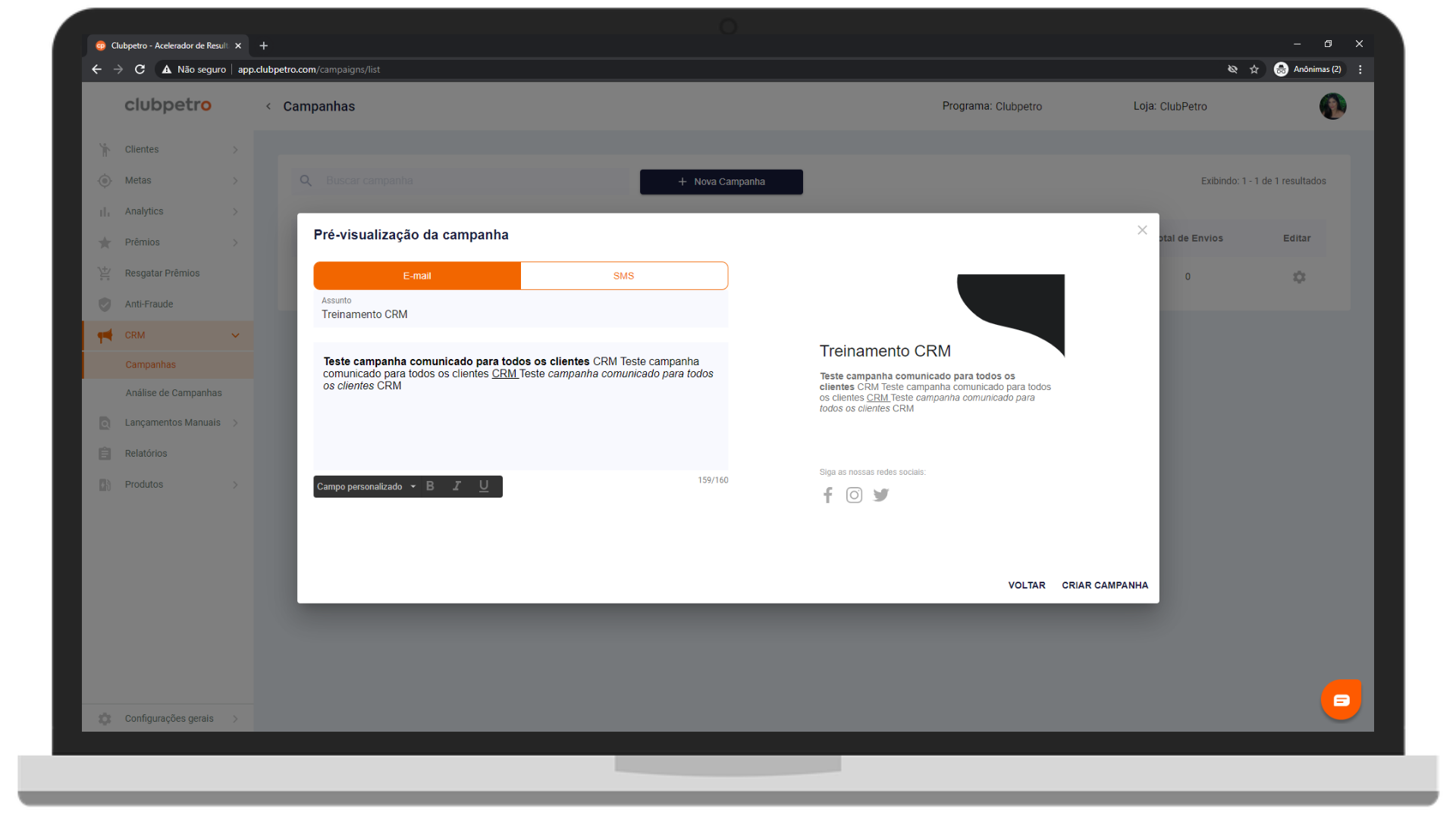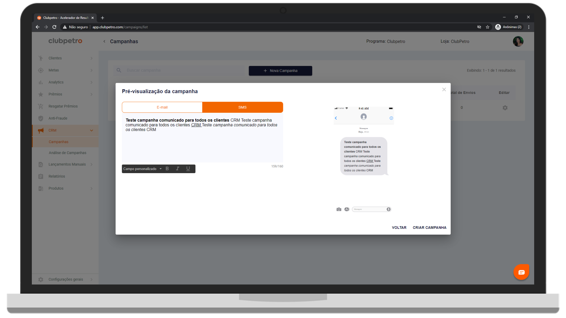 O tipo de campanha Comunicado para todos os clientes pode ser utilizada para oferecer algum benefício para a base de clientes ou apenas para informar sobre algum assunto.