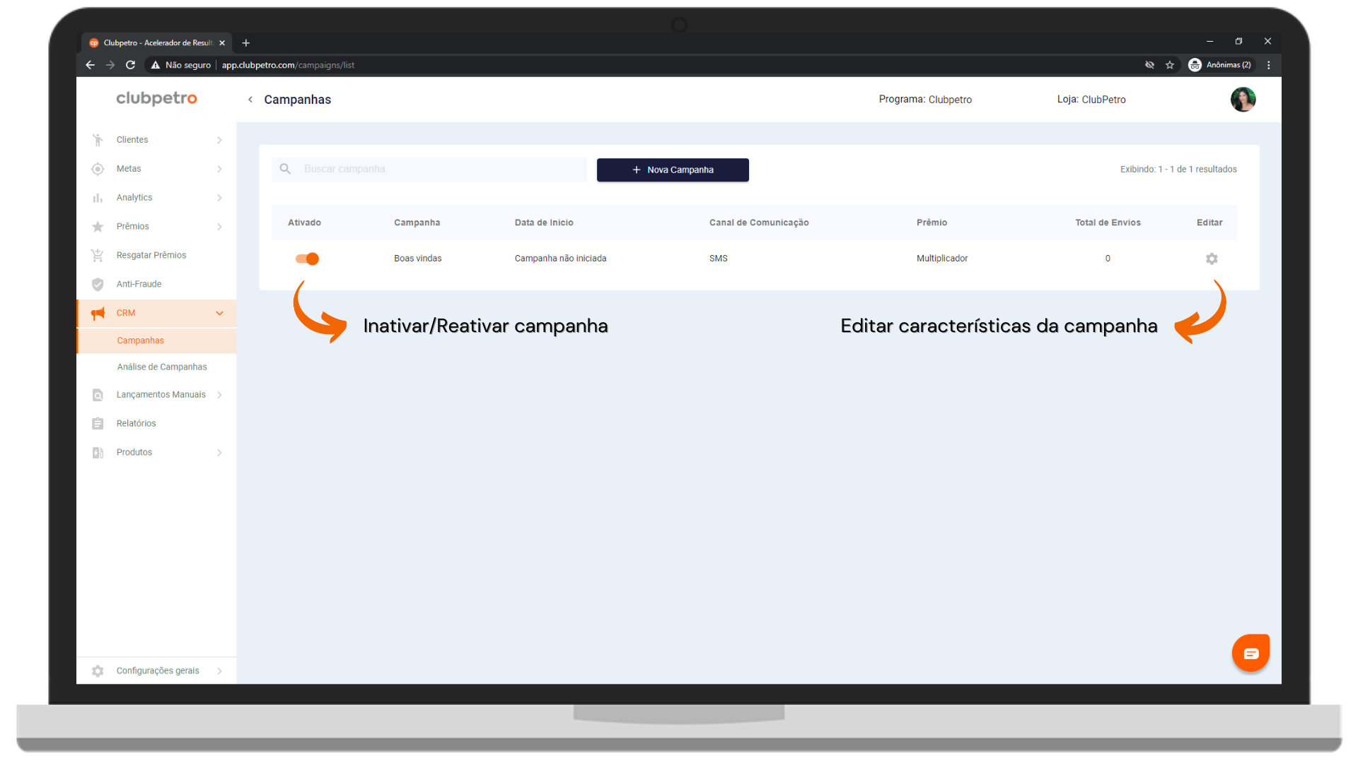 Para inativar ou reativar uma campanha, basta mover o toggle no início da linha.