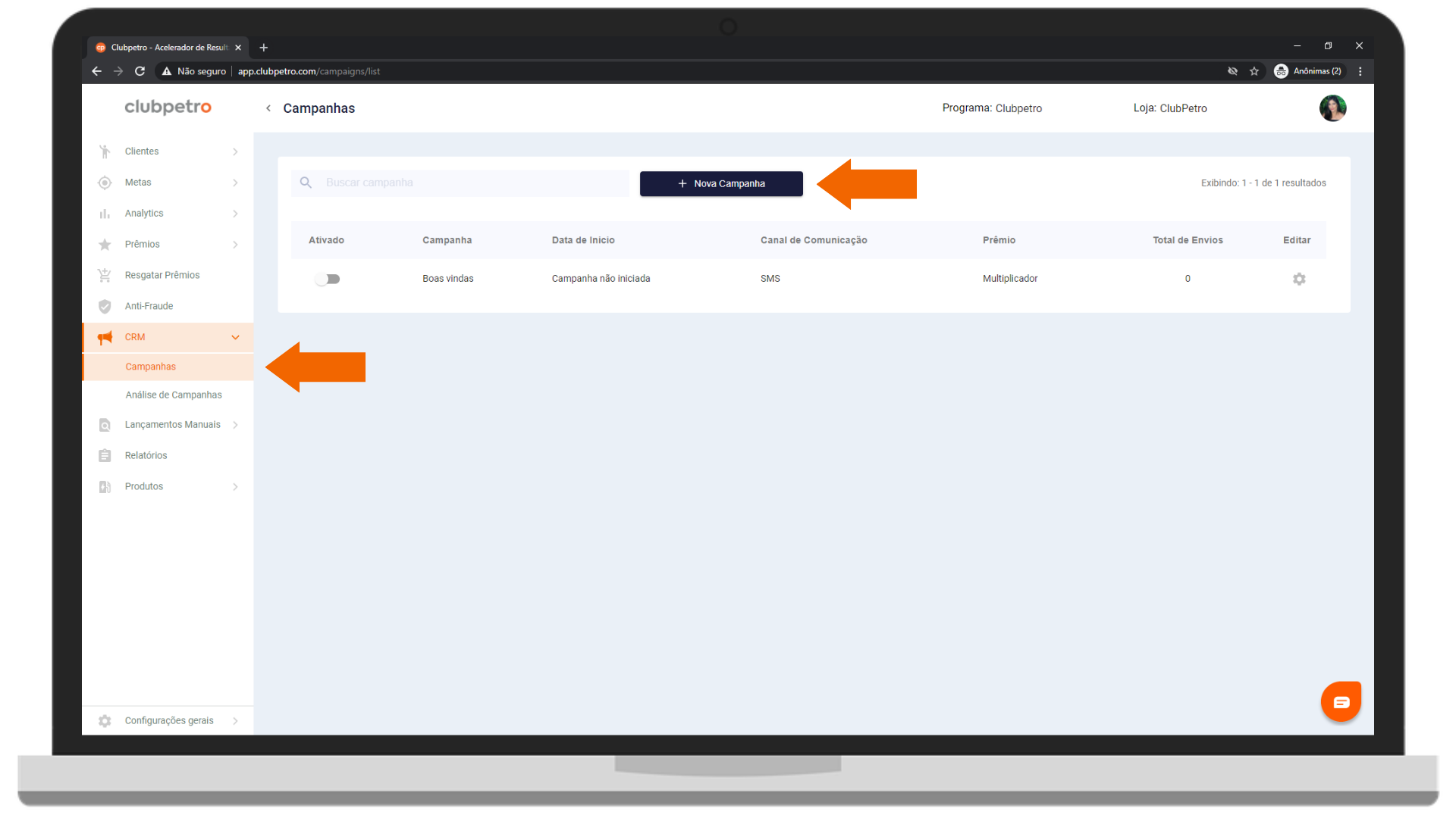 Para cadastrar uma nova campanha, clique no botão +Nova Campanha.