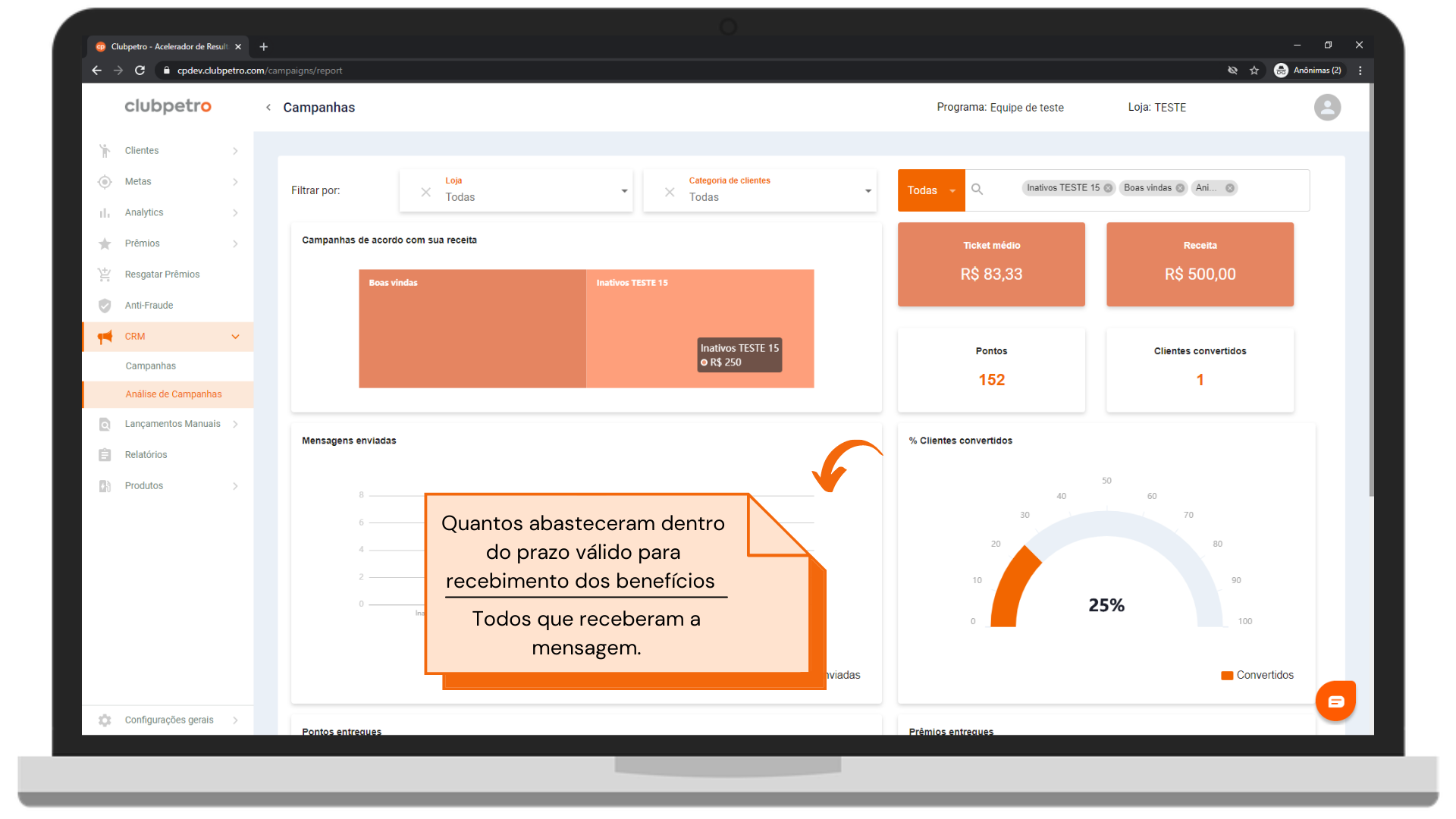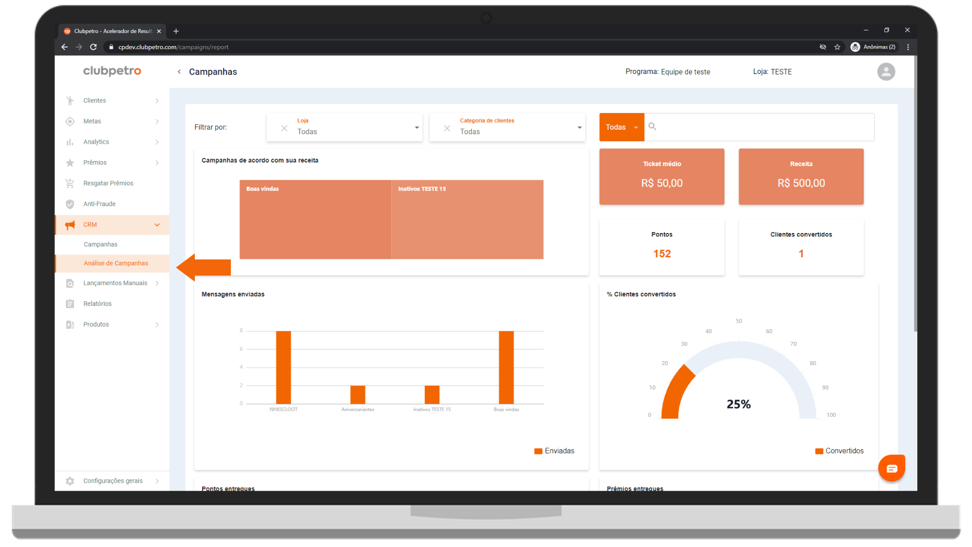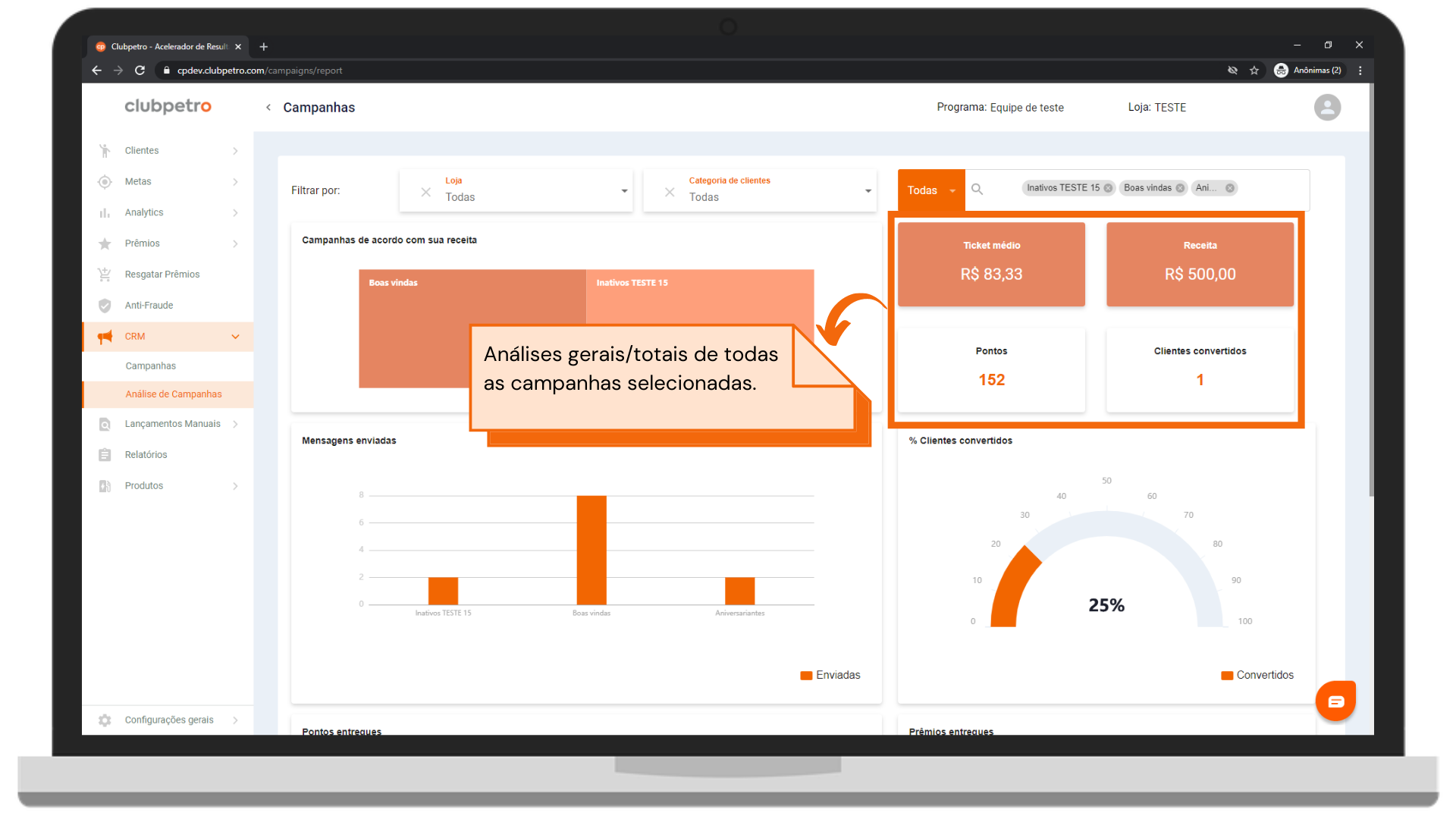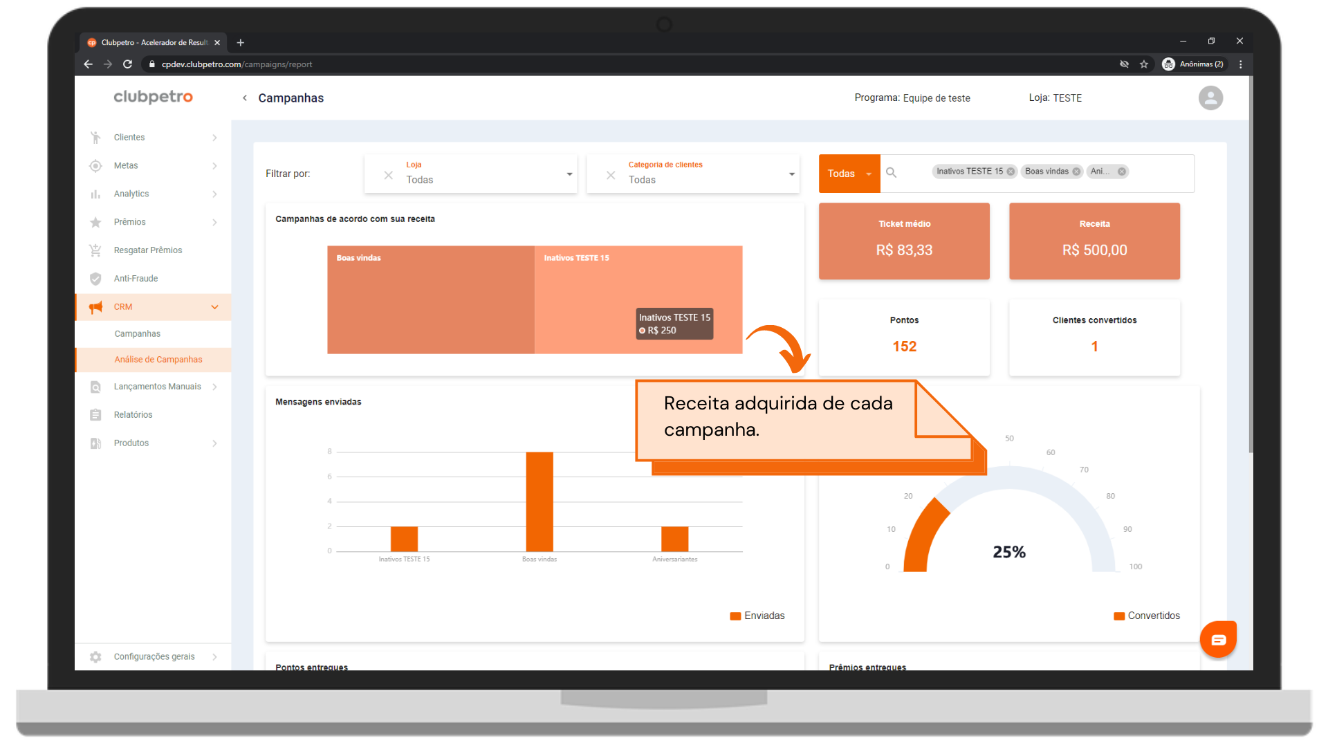 O CRM oferece um relatório para fazer análises do sucesso das suas campanhas.